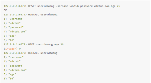 哈希是 Redis 2.0 之后才增加支持的数据结构,简单来说就是一个字典,直接看具体例子就很好懂了: