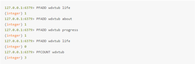 Redis 2.8.9 版本中添加了这个新的结构,命名也很有趣,走 ABB 的套路,比如范冰冰高圆圆李思思就是这么个意思。这个结构是用来做基数统计的,基数统计是什么,来看两个例子:1) 数据集 {1, 3, 5, 7, 5, 7, 8}, 那么这个数据集的基数集为 {1, 3, 5 ,7, 8}, 基数(不重复元素)为 5。2) 一个网站有很多访客记录,因为每个人不一定只访问一次,如果我想知道独立访客的人数的话,就需要计算一个基数,这时候就可以用 HyperLogLog。好处在于即使数据量非常大,计算所需的空间是小而固定的。每个 HyperLogLog 的键只占用 12KB 的内存,但是可以计算 264264 个不同的基数。具体怎么实现的我还没有看源码,但估计跟 bloomfilter 的思路是一样的。简单举个例子:
