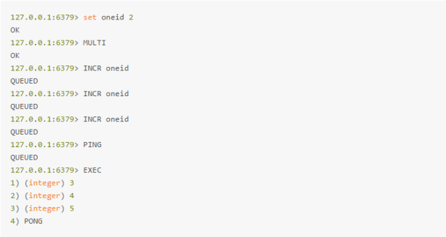 在上面的例子中,我们看到了 QUEUED 的字样,这表示我们在用 MULTI 组装事务时,每一个命令都会进入到内存队列中缓存起来,如果出现 QUEUED 则表示我们这个命令成功插入了缓存队列,在将来执行 EXEC 时,这些被 QUEUED 的命令都会被组装成一个事务来执行。