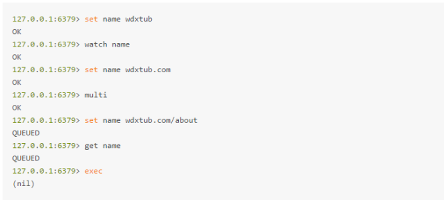 然后我们来说说 WATCH 这个指令,它可以帮我们实现类似于“乐观锁”的效果,即CAS(check and set)。WATCH本身的作用是“监视key是否被改动过”,而且支持同时监视多个key,只要还没真正触发事务,WATCH都会尽职尽责的监视,一旦发现某个key被修改了,在执行EXEC时就会返回nil,表示事务无法触发。例如: