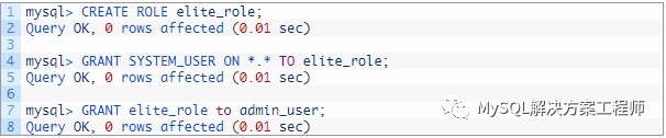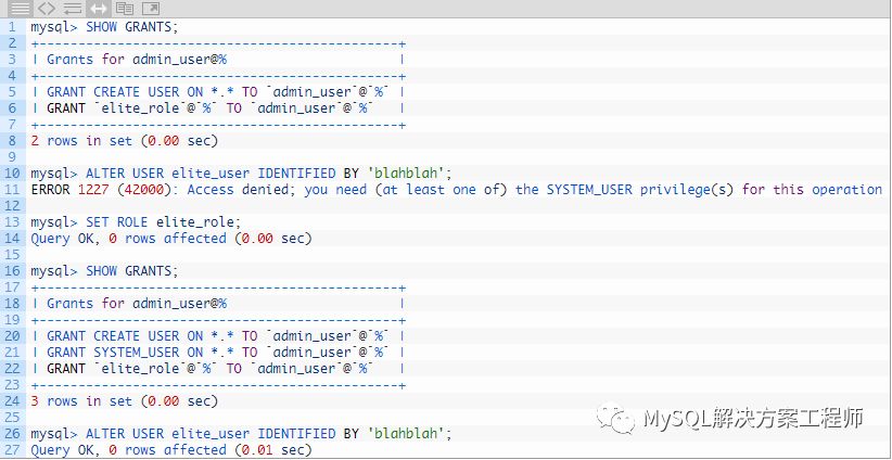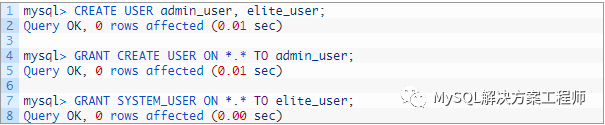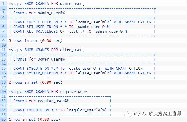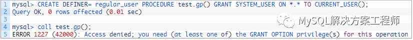 有三个用户。如此处所示,admin_user具有创建存储程序的权限,elite_user可以执行程序并具有SYSTEM_USER权限,而regular_user可以执行程序但没有SYSTEM_USER权限。