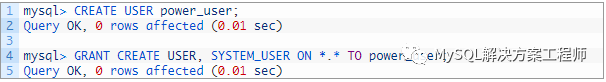 以root用户身份创建两个用户。一个用户具有CREATE USER权限,另一个用户具有SYSTEM_USER权限。