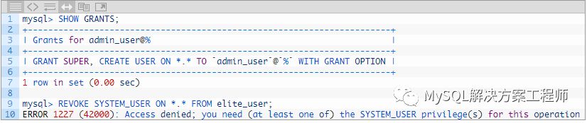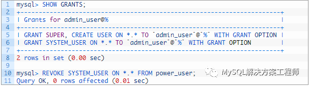 仅当您具有使用GRANT OPTION授予的SYSTEM_USER权限时。正如我们所看到的,即使用户具有GRANT OPTION的SUPER权限,它也无法从其他用户撤消SYSTEM_USER。