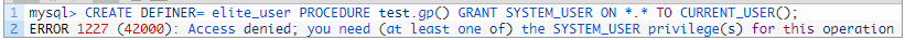admin_user尝试使用具有SYSTEM_USER权限的定义程序创建存储程序,但它会收到错误。