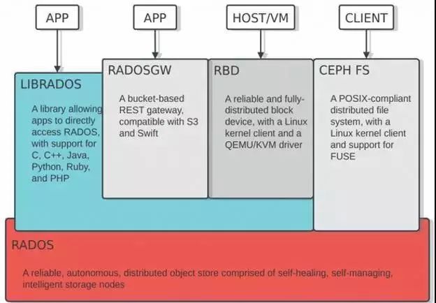 基础存储系统RADOS(Reliable, Autonomic, Distributed Object Store,即可靠的、自动化的、分布式的对象存储)。
