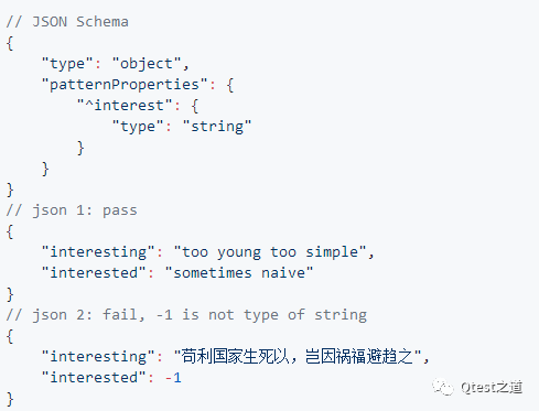 5.patternProperties: object, 该项的键为正则表达式,用以匹配可能出现键,该项的值为有效的schema数据