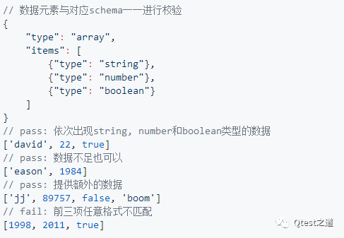 1.2.array,每个元素均为一个有效的schema,用一一对应的方式对数组中的元素进行校验