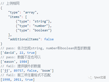 2.additionalItems: boolean, 如果出现该项且为false,那么items中值为array的情况下,对应数据中不可出现额外的项