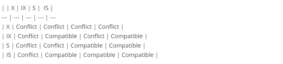 可以看到,意向锁与意向锁兼容,IX、IS自身以及相互都兼容,不互斥,因为意向锁仅表示下一层级加什么类型的锁,不代表当前层加什么类型的锁;IX和表级X、S互斥;IS和表级X锁互斥。其兼容性正好体现了其作用。
