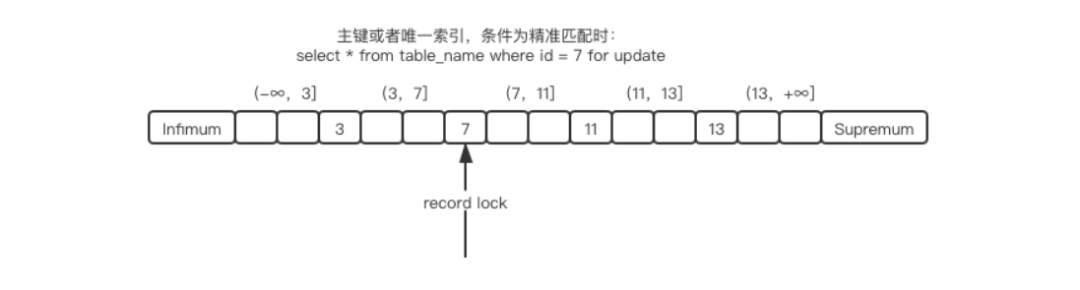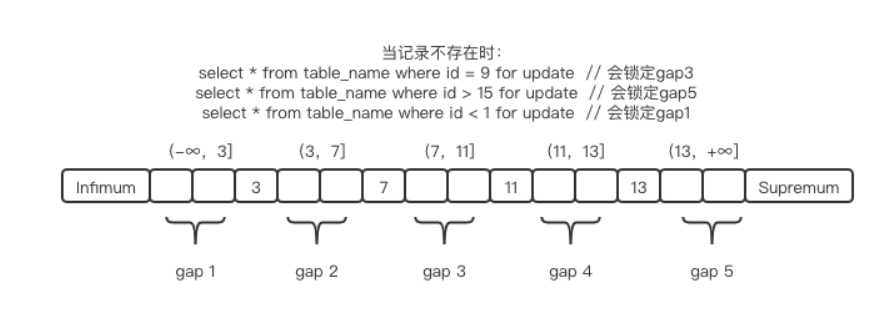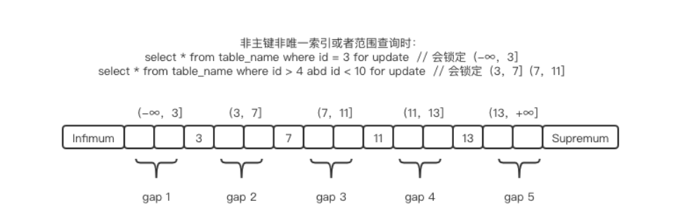 之间的间隙。比如第一条语句,查询的时候就算是等值匹配,只要这个不存在的数据落在两个索引节点之间,就算不是一个范围,也会锁住索引节点间的所有数据即gap3,范围(7,11)。