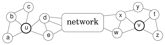struc2vec考虑的重点是图节点附近结构的相似性问题,上图的这个网络中,尽管节点uv在网络结构上很相似,但是因为其距离较远,因此如deepwalknode2vec等直接在图上进行随机游走的算法很难将这两个节点作为上下文节点进行训练,在生成的嵌入向量上其差距也会比较大。struct2vec通过节点邻居的度信息构造一个多层次的网络来提高这类结构相似节点之间的权重,最终在随机游走采样时这些结构相似节点就很可能被采样到同一个上下文中。