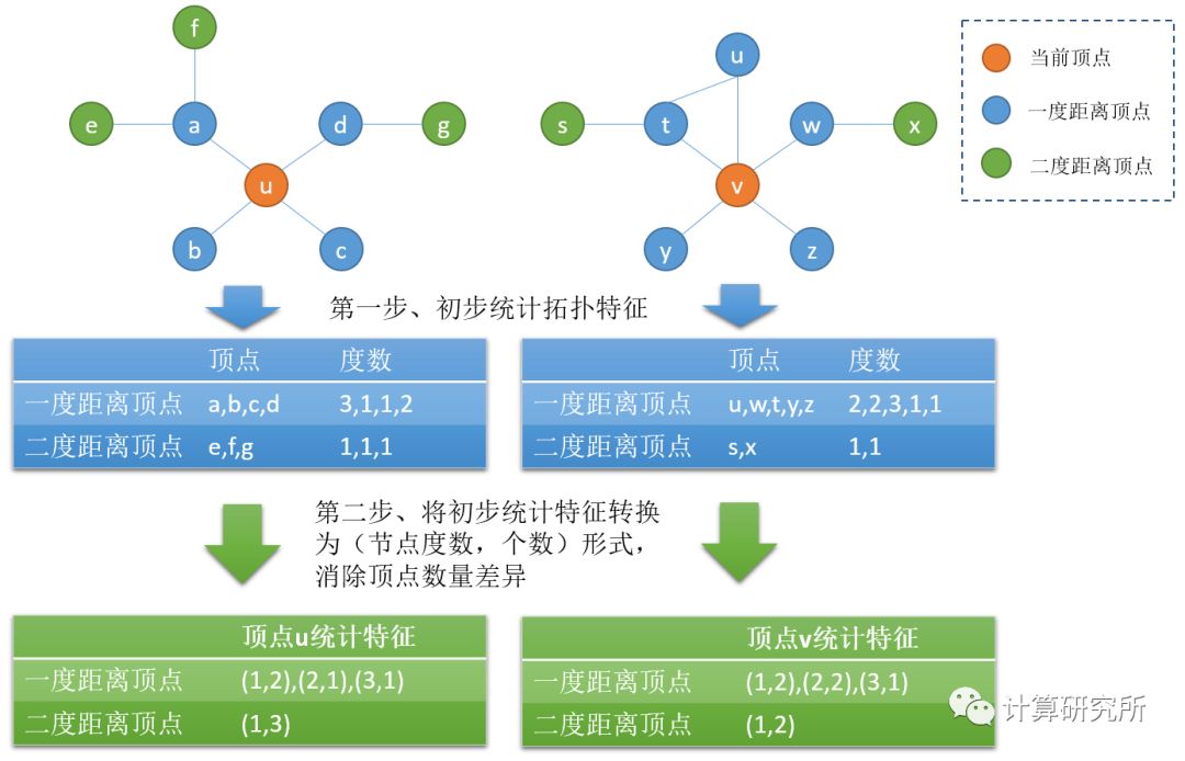 首先,struc2vec会分别统计每个节点的k度距离邻居,以及每个邻居的度数,以每个节点外扩k层的每个邻居度数统计信息来表征这个节点的网络结构形态: