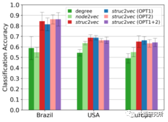 struc2vec的作者在论文的实验部分贴出了这张与node2vec的对比结果,可以看到相对于node2vec的精确度,struc2vec及其各种近似优化算法(OPT1/2)的效果均提高了10%-20%