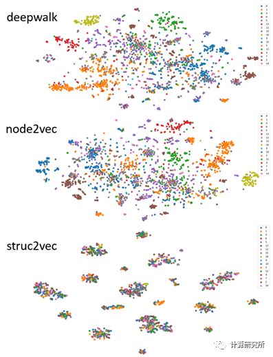 deepwalk的节点混淆最严重;node2vec节点也存在混淆,看不出明确的分类面;struc2vec除了红色和部分绿色类别节点外,其它类别基本上能做到相对良好的分类