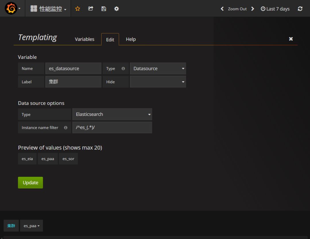4、 无法模板化配置图表,ElasticSearch中若需要配置功能相同只是index不同的多个图表时,需要挨个逐一配置,工作量令人崩溃……