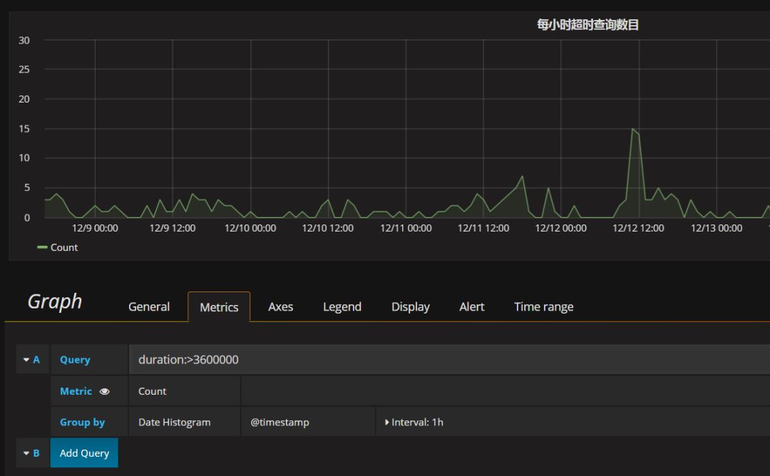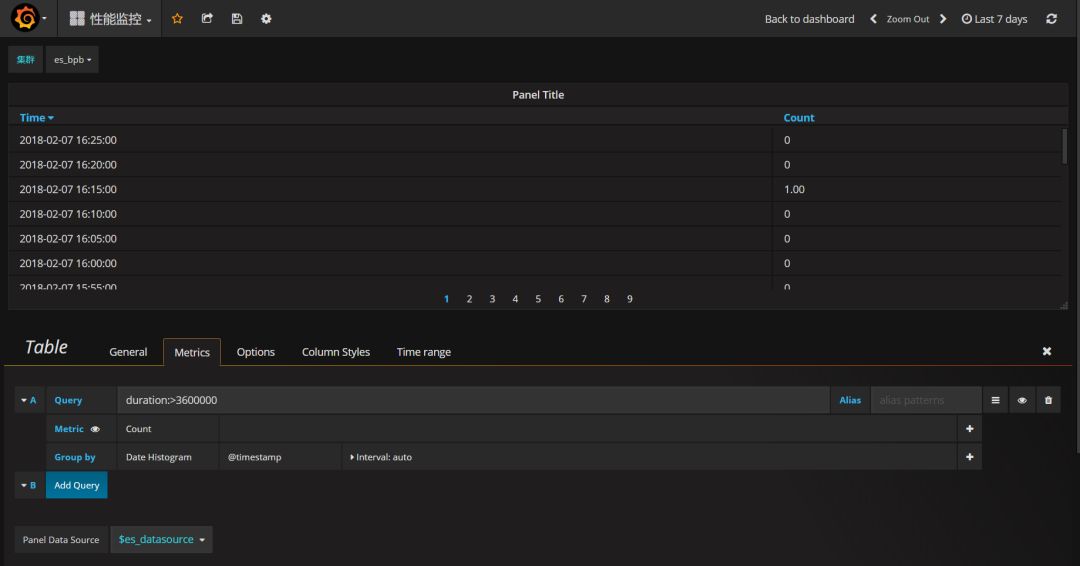 将需要展示的数据使用和Kibana一致的Lucene语法描述查询并填入Query栏,Grafana即可实时展示查询到的数据。
