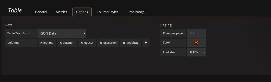 表格默认的展示形式是显示按时间段的统计结果,要显示更多内容可以在Option中将Table Transform改为“JSON Data”并在下方添加需要显示的字段