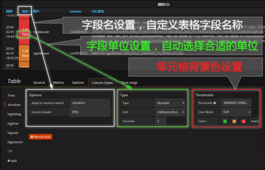 查询执行时间超过一小时(3600000毫秒)的SQL语句以及相关信息将在表格中展示出来,并根据不同查询时长标示出不同的单元格颜色