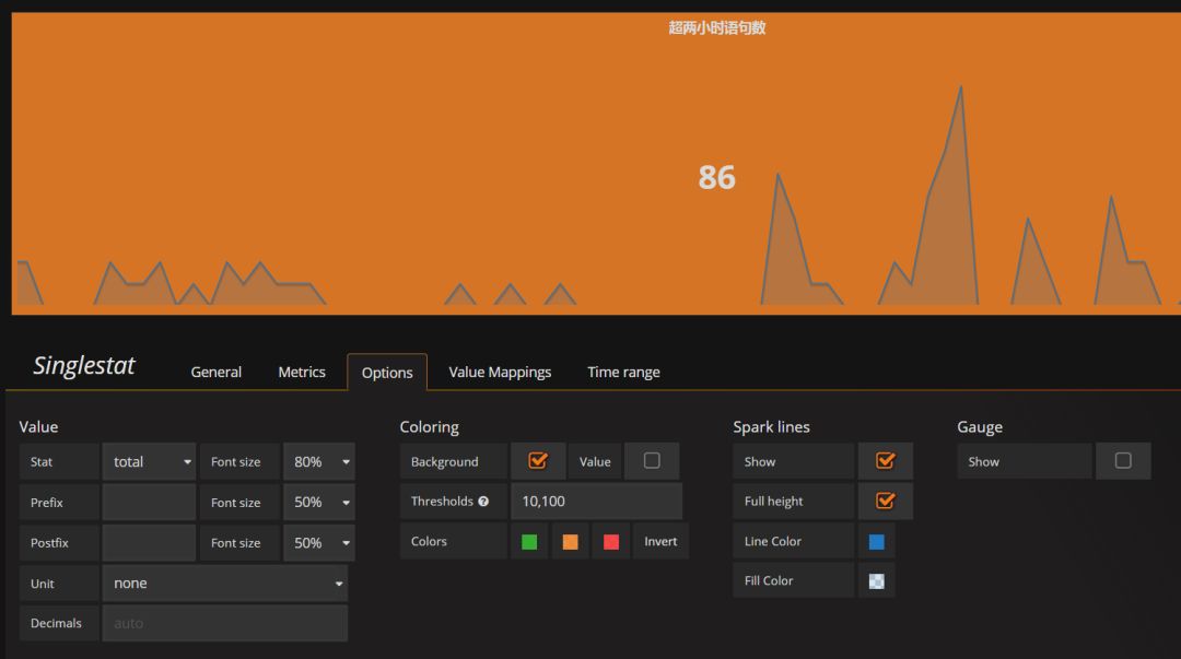 单数值面板主体只能显示一个查询到的数值,选项中可勾选显示Spark lines以显示查询到的记录数随时间分布情况,与表格一样,可以在Coloring的阈值设置中设置根据不同结果显示不同背景色