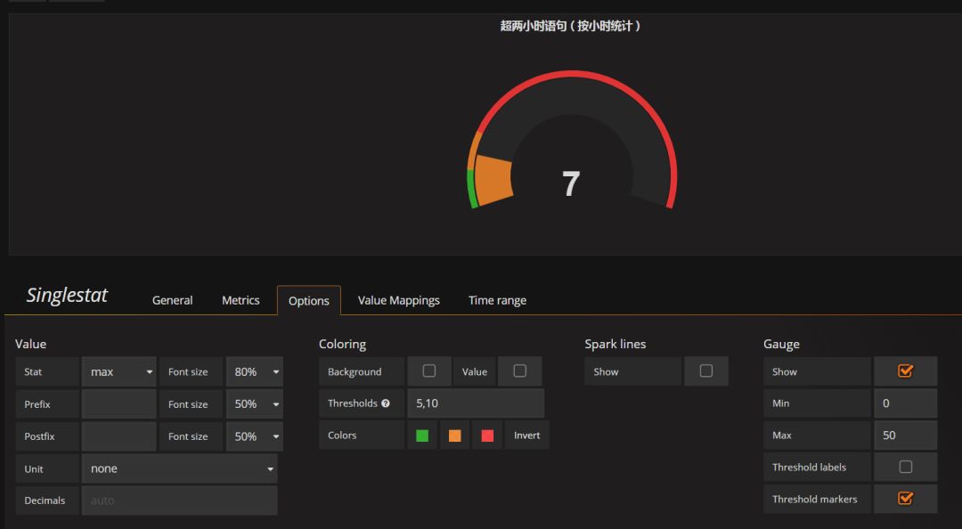 勾选显示Gauge可显示一个仪表盘,依然需要设置Coloring的阈值。