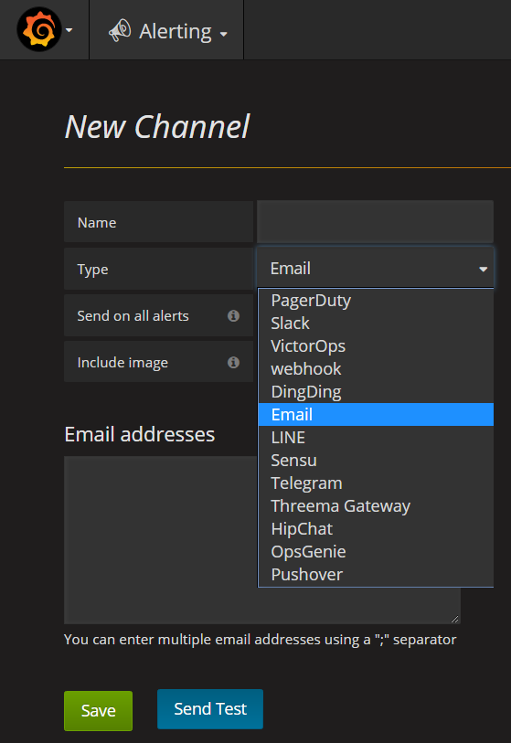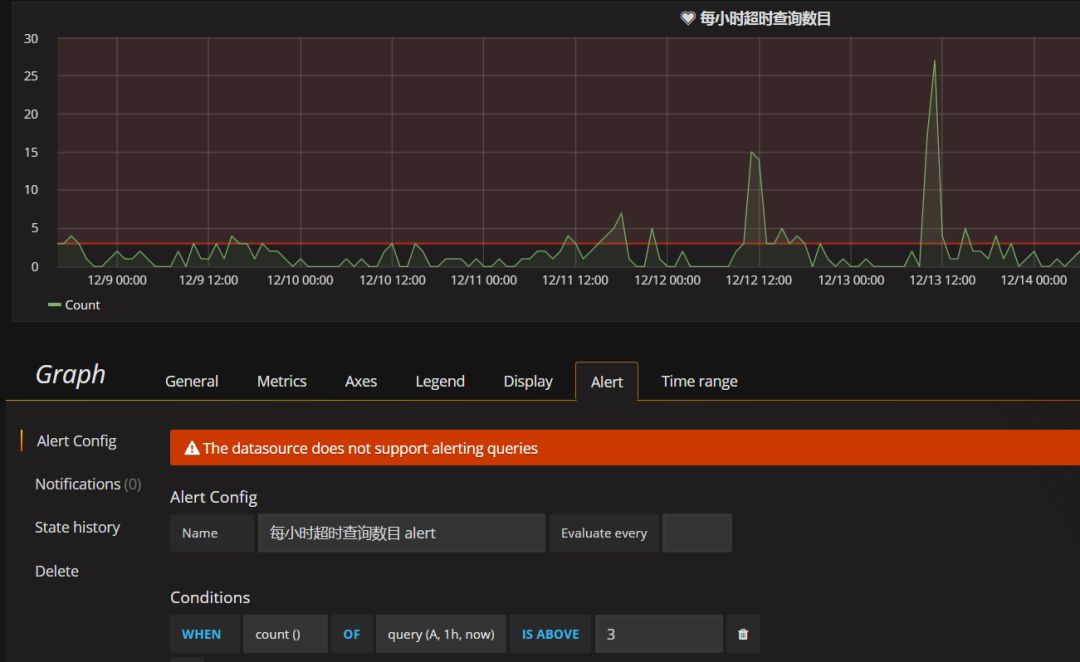 目前版本对ElasticSearch数据的告警支持不完善,只能在图上显示告警阈值,方便观察,还不具备自动发送告警的能力。