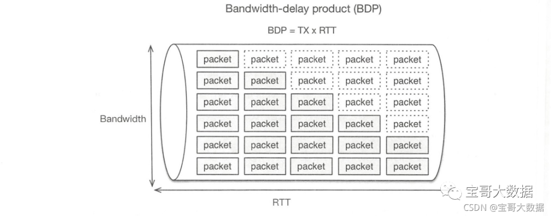 网络连接通常以管道为模型,BDP是带宽与RTT的乘积,表示需要多少数据填充管道。下图展示了BDP的基本概念。