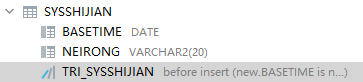 create trigger TRI_SYSSHIJIANbefore inserton SYSSHIJIANfor each rowwhen (new.BASETIME is null)beginselect sysdate into :new.BASETIME from dual;end;