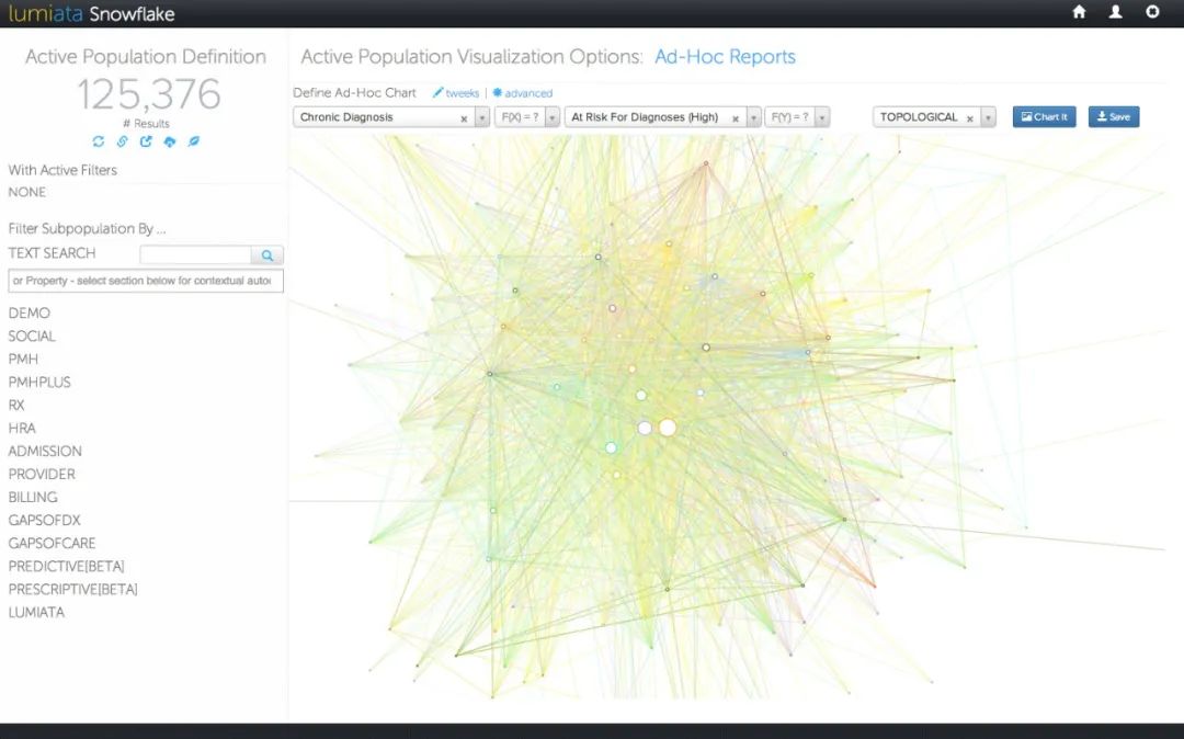 Lumiata是首家提出“医疗图谱(medical graph)”的公司,他们把电子病历和病理生理学等数据整合起来,并通过图谱分析的方式去模拟人类的多维推理过程,进而预测出病人会需要什么、以及何时需要。利用这些数据,Lumiata还可以去分析和预测一个人群整体的健康状态。