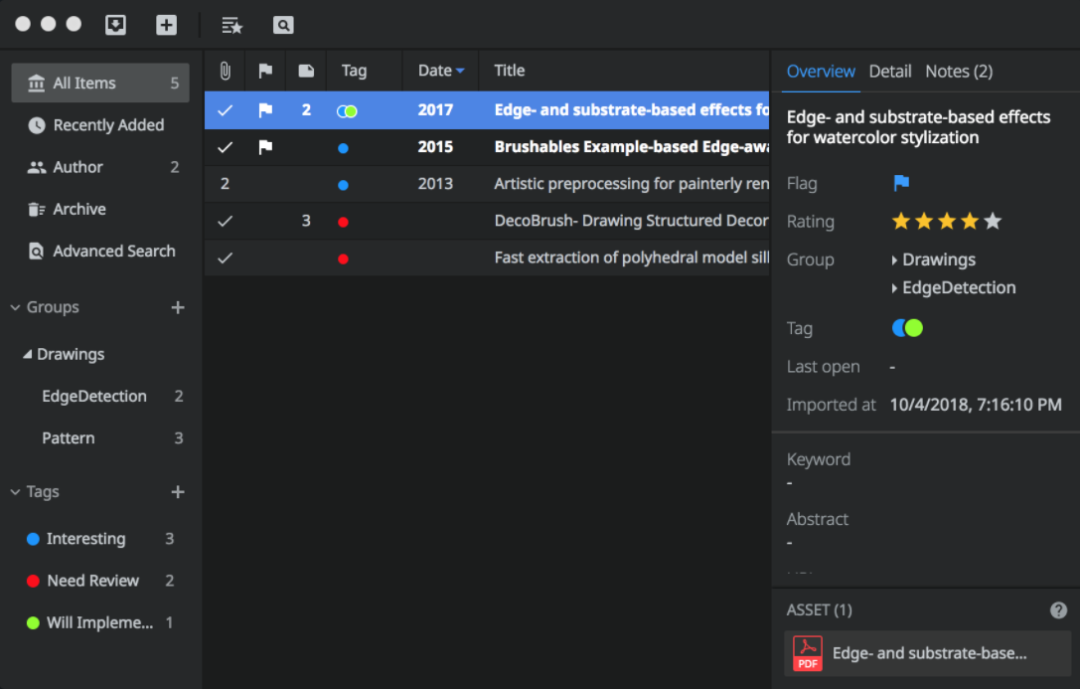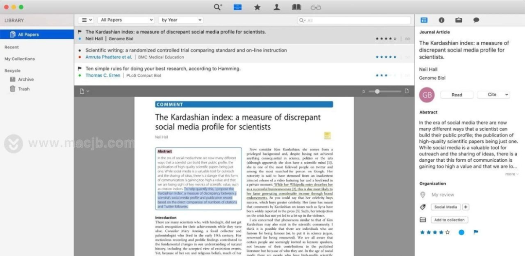 Papers 3 for Mac功能介绍。1、搜索并保存。搜索您最喜欢的搜索引擎(在应用程序中和通过我们的Chrome扩展程序),享受一键下载,快速将参考文献和全文PDF添加到您的图书馆。查看我们的推荐引擎和相关文章提要,以确保您再也不会错过重要的文章。2、阅读和注释。利用全屏增强型PDF阅读器。Papers 可以帮助您专注于手头的任务。突出显示,下划线,穿透,制作内联音符,绘制和添加便签。使用选项卡在不同文档之间切换,查看补充文件或跳转到引用的文章 - 方便地内联链接。3、使用SmartCite更快地引用。我们的用户喜欢SmartCite,因为它快速,可靠,最重要 - 易于使用!只需将SmartCite外接程序添加到Word 2016,您就可以直接从Word文档访问整个库。搜索您的个人或共享馆藏中的参考文献或使用我们的内置搜索引擎。APA,MLA,Chicago,IEEE,Nature ......从SmartCite内置的8000多种引用样式中进行选择。需要特定的东西?定制自己的风格!SmartCite是为了协作而制作的,所以只需将您的文档通过电子邮件发送给其他Papers用户,他们就可以在您离开的地方接听!现在是组织起来的时候了,告别桌面杂乱和那些未分类的PDF文件夹。Papers自动识别和匹配导入的文章,不仅包括完整的元数据,还包括可用的补充数据,引文和全文(如果有)。更重要的是,使用标签,标签,评级智能收藏和观看文件夹,让您在旅途中保持井井有条。4、分享与协作。借助新的共享功能,Papers用户可以创建私有共享集合,以与最多25个其他Papers用户协作。完美的合作,期刊俱乐部,或处理即将到来的手稿。5、跨设备同步。安全地同步整个库,包括笔记,列表,注释,甚至是所有设备的亮点,包括桌面(Mac PC),移动设备(iOS / Android / Kindle)甚至是网络。此外,您还可以为不断增长的ReadCube库享受无限的云存储空间。