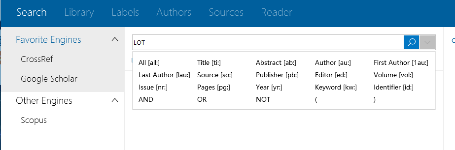可以通过搜索题目,作者,摘要等内容中的关键词来查找文献,也提供各种联结词(AND,OR)来辅助搜索。搜索出的文献可以直接导入到个人Library,同时也会保存在本地。
