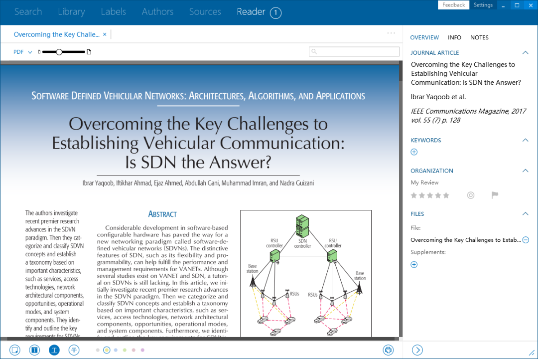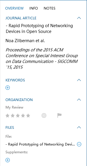 本地导入,整理。导入文献后,Library界面会出现文献项,可以将文献加入自己的收藏集中分类或归档,界面右边是关于这篇文献的相关信息。综述:可以在这个界面添加关于文献的关键词,评论和各种标签。