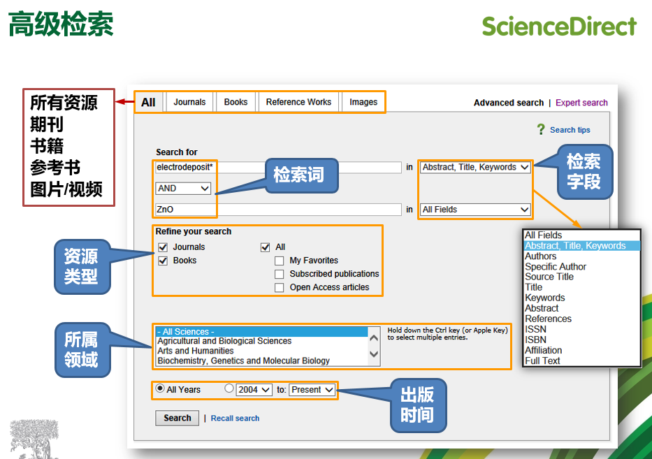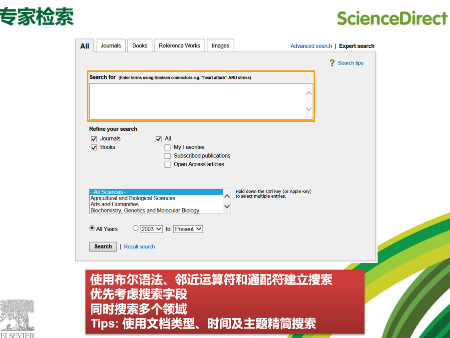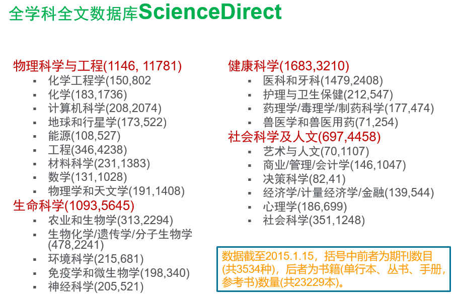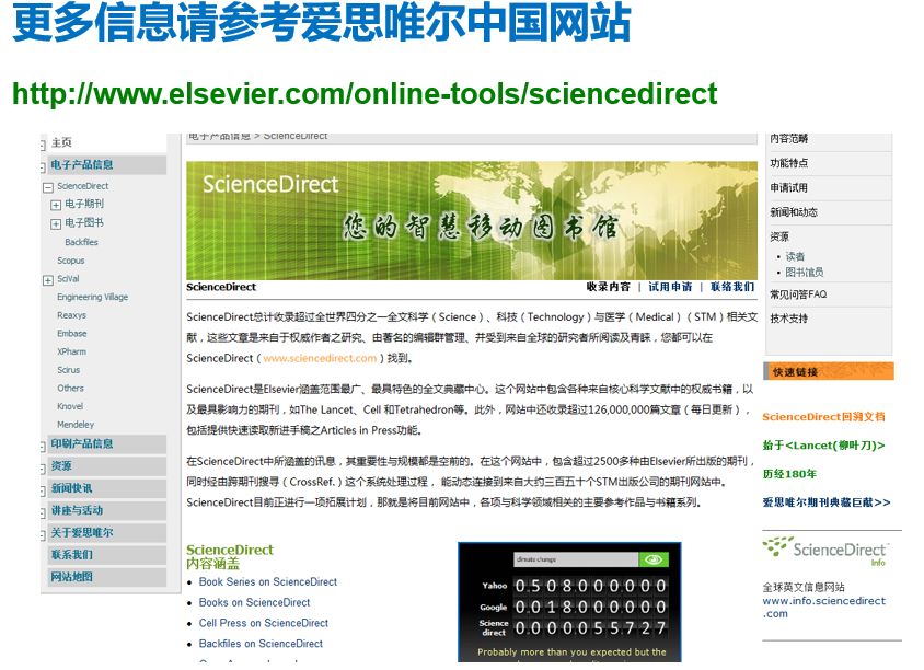 关于ScienceDirect:ScienceDirect由爱思唯尔(Elsevier)公司出品的全学科全文数据库,收录了超过全世界25%的科学、技术和医学(STM)方面的文章,其中被SCI收录的期刊占核心期刊品种的1/4;覆盖24个学科领域,全文数量超过1300万篇,同时提供上万种电子图书,是全球应用最广泛的全文数据库。使用SD数据库请登录www.sciencedirect.com。