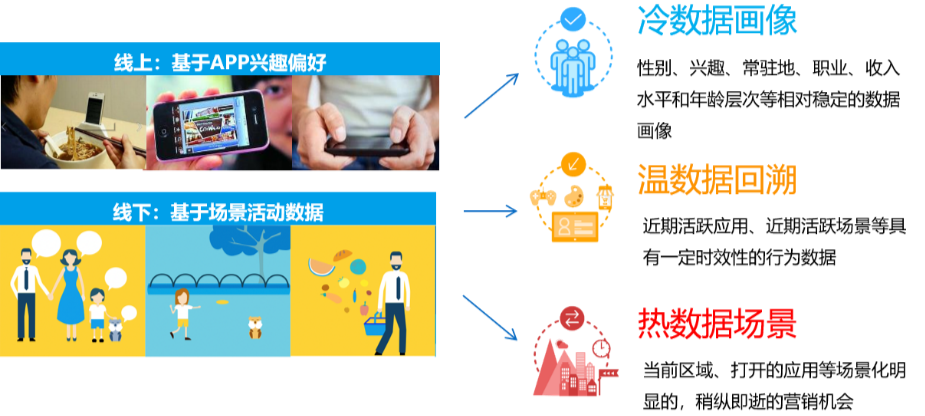 冷数据:性别、兴趣、常驻地、职业、收入水平和年龄层次等相对稳定的用户画像数据。温数据:近期活跃应用、近期活跃场景等具有一定时效性的用户行为数据。热数据:当前区域、当下打开的应用等场景化明显的实时数据。