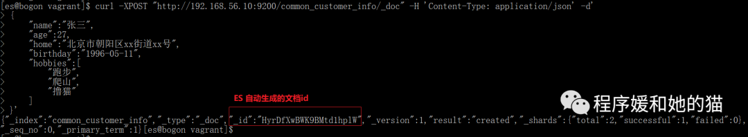 1、使用 curl 命令,创建文档(不指定文档id,使用 ES 自动生成的文档id)。