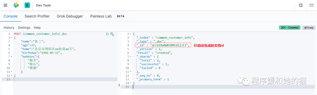 2、使用 Kibana,创建文档(不指定文档id,使用 ES 自动生成的文档id)。