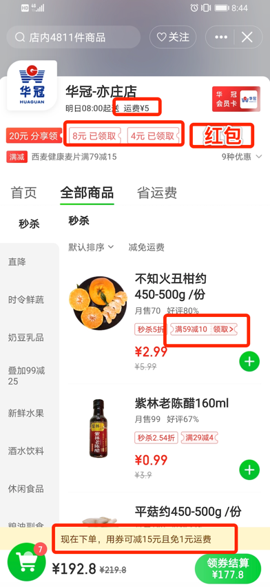 上图为到家门店主页,在门店主页优惠券系统承接5处利益曝光,从上向下分别为:门店运费优惠、门店商品券、红包、商品预估到手价、购物车领券结算,其中有6个优惠券接口承接这5处资源位。介绍下商品预估到手价和购物车领券结算。