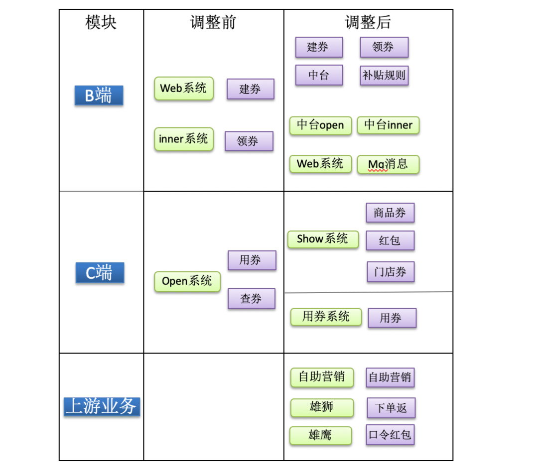 调整前:所有的业务基本分为建券、领券、用券和查券,系统分为open(对C端服务)、inner(对B端服务)、web(运营端)三个项目,随着业务不断发展,带来了一系列问题。