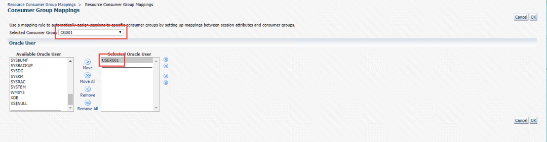 我们刚才创建了一个用户user001,现在将这个用户放入CG001这个Consumer Groups当中。您在工作中,可以将多个用户按照业务类型或者功能类型进行划分,将他们放入相同的资源组当中。