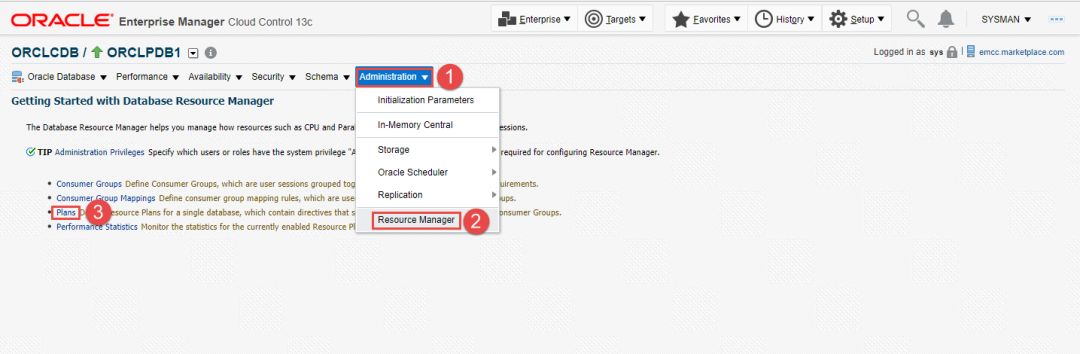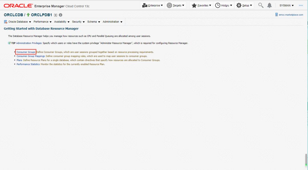 创建资源计划的方式有很多种,常见的有使用DBMS包中的存储过程来创建,也有使用Enterprise Manager Cloud Control来创建。最简单的方法就是通过Enterprise Manager Cloud Control来创建,只需动动鼠标即可轻松创建。但有些朋友会抱怨说,Enterprise Manager Cloud Control虽然好用,但是安装非常麻烦,首先要安装数据库软件,然后使用特定模板创建符合EM要求的数据库,之后再部署EM。在部署的过程中,如果执行脚本出现错误,只能重新安装。一般需要几个小时的时间才能安装完成。现在Oracle MarketPlace当中直接向大家提供了创建好的EM13c镜像,您只需要创建一个OCI instance,然后让系统自己执行安装,大概最多20分钟就完成了EM的创建,本次我使用的是2C 30GB的OCI环境,从开始创建instance,到出现下面的管理界面,使用15分钟的时间(该时间仅供参考)。