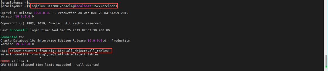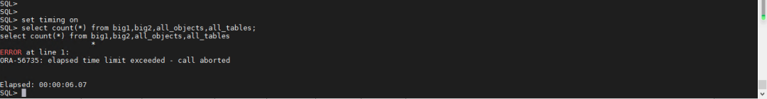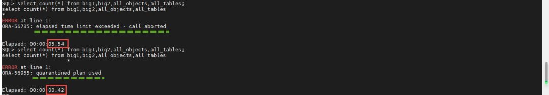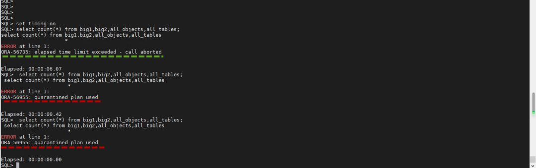 大家通过观察发现,第一次执行这个SQL语句,还是资源计划在阻止它,也就是说,先执行一会儿,达到资源计划的设定值的时候,再阻止运行。再次执行这个语句的时候,就会看到下方的结果。这个语句没有被数据库执行,而是直接终止掉。并且提示的信息变成ORA-56955: quarantined plan used