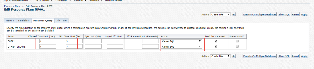 我们今天创建一个资源计划,限制SQL语句执行的时间,如果超过5秒钟就取消SQL的执行。