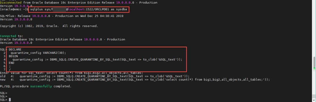 如我们刚才所说,您可以根据SQL_ID或者SQL_TEXT进行设定,我们今天就使用SQL_TEXT进行设定。请以sys身份登录ORCLPDB1