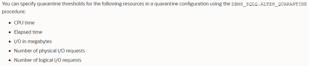 今天向大家介绍Oracle Database 19c的新特性,SQL隔离。他的作用是防止消耗资源过多的SQL语句拖慢系统或者导致系统无法访问的情况发生。也许大家会说,这项功能早在10g就可以通过资源计划来实现啊。但19c当中的SQL隔离与之前的资源计划是不同的,比如在之前的资源计划当中,我们设定了一个规则,如果SQL执行时间超过20秒,那么就取消这个SQL的执行。在实际的运行中,这个SQL必须执行到了特定的时间或者已经消耗了特定的资源才能够停止或者做其他的转换动作,比如换到其他的资源组。如果是这样的话,资源和时间都已经消耗完毕了。如果使用19c的SQL隔离功能,那么就可以直接阻止SQL的执行,避免资源被消耗。关于SQL隔离的创建与配置,可以通过如下方式: