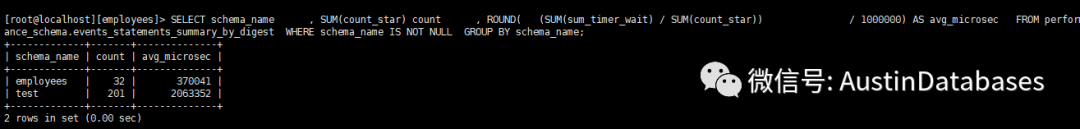 SELECT schema_name , SUM(count_star) count , ROUND( (SUM(sum_timer_wait) SUM(count_star)) / 1000000) AS avg_microsec FROM performance_schema.events_statements_summary_by_digest WHERE schema_name IS NOT NULL GROUP BY schema_name;