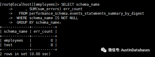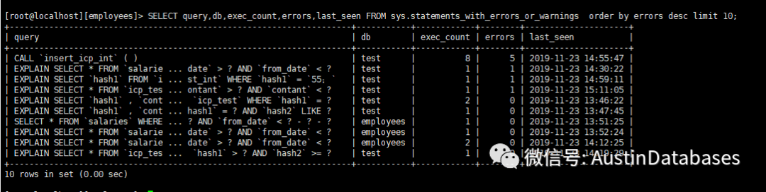 10 问:那我想知道某个库中那些总体语句的延迟比较高,执行次数与错误的次数的对比