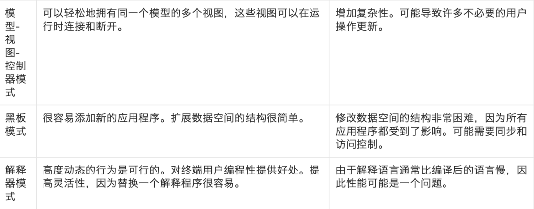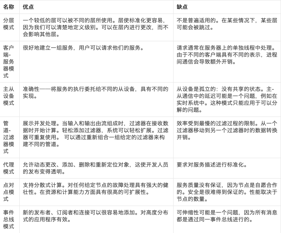 下面给出的表格总结了每种体系架构模式的优缺点。