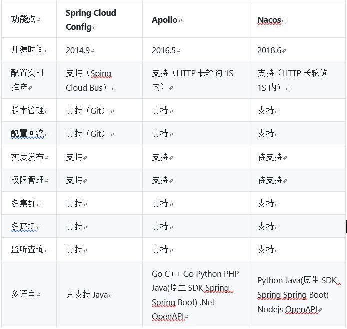 由于Disconf不再维护,下面对比一下Spring Cloud Config、Apollo和Nacos。