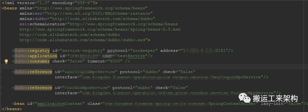 3、dubbo consumer配置文件。我们的压测对象是提供服务,也就是provider。那么我们的压测工具就相当于consumer了。