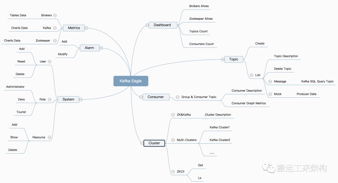 在使用Kafka Eagle监控系统之前,笔者简单的介绍一下这款工具的用途。Kafka Eagle监控系统是一款用来监控Kafka集群的工具,目前更新的版本是v1.2.3,支持管理多个Kafka集群、管理Kafka主题(包含查看、删除、创建等)、消费者组合消费者实例监控、消息阻塞告警、Kafka集群健康状态查看等。目前Kafka Eagle v1.2.3整个系统所包含的功能,这里笔者给绘制成了一个图,结果如下图所示: