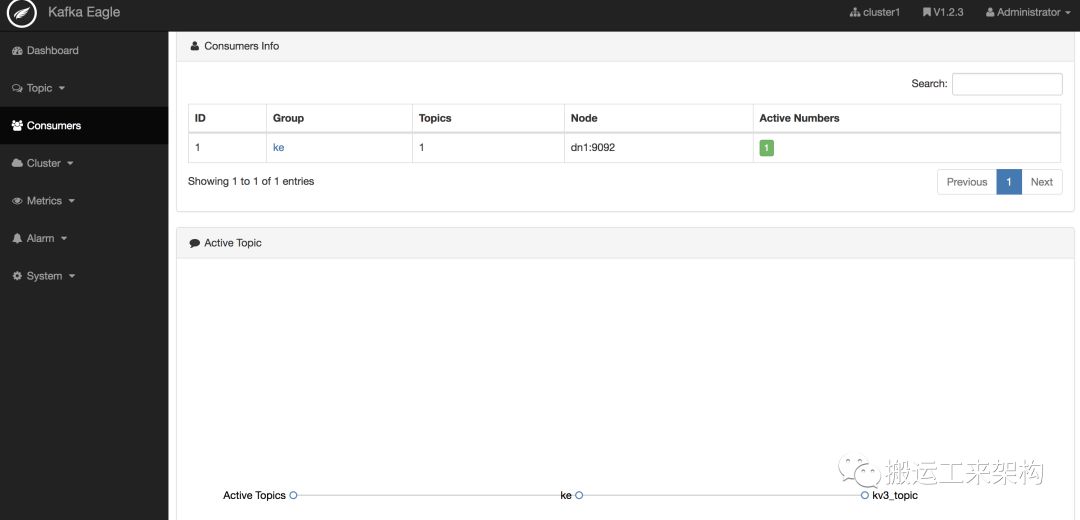 但是,如果你虽然使用的是Kafka 0.10.x之后的版本,但是你使用的消费者API还是0.8.2.x或是0.9.x时的写法,此时的消费者信息是会被记录到Zookeeper中进行存储,那么此时你需要设置kafka.eagle.offset.storage=zookeeper或者注释掉该属性,在访问Kafka Eagle系统就可以查看到你的消费者详情了。